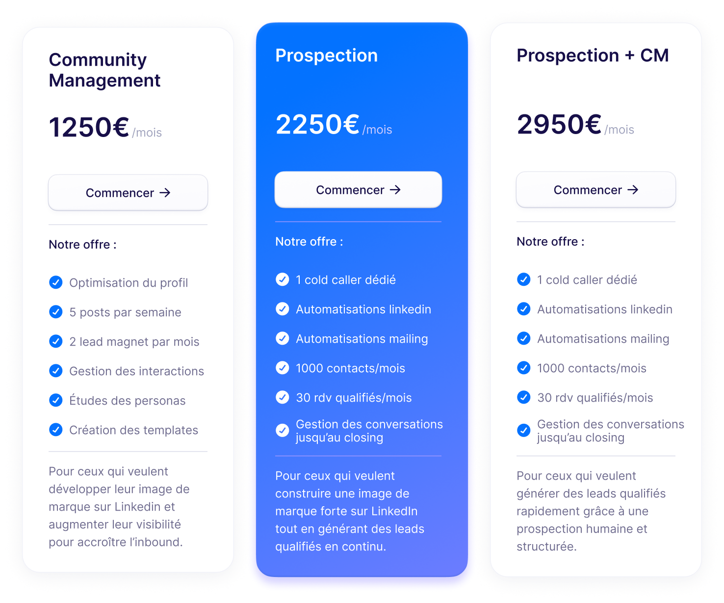 Trouvez de nouveaux clients et devenez visible sur Linkedin Nous vous garantissons au moins 30 RDV qualifiés/mois avec votre client idéal. En bref, on prospecte, vous closez.