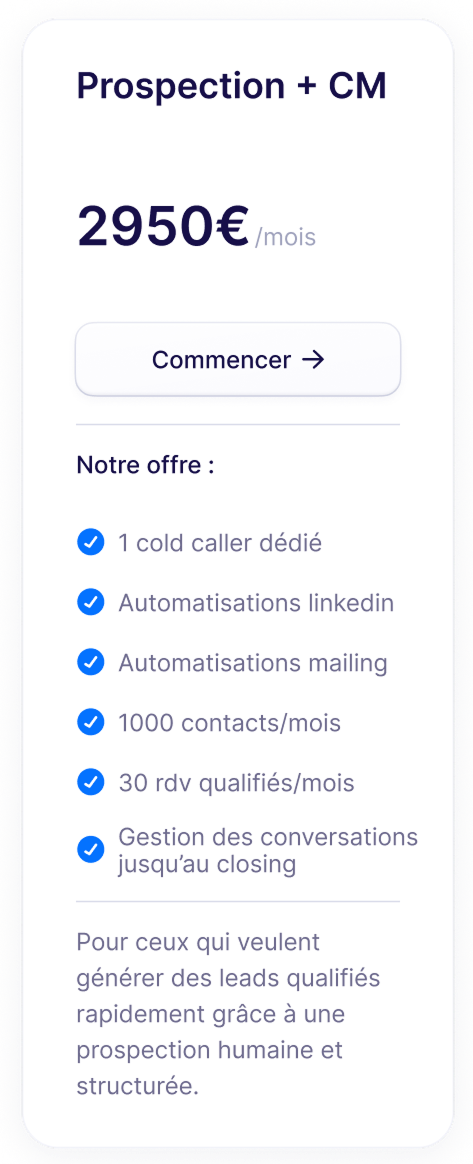 L'externalisation vous donne accès à une expertise, à des outils avancés et à une équipe dédiée, sans les coûts et le temps associés à la création d'un département interne. Nous devenons une extension de votre équipe, en alimentant votre pipeline de manière constante et prévisible.